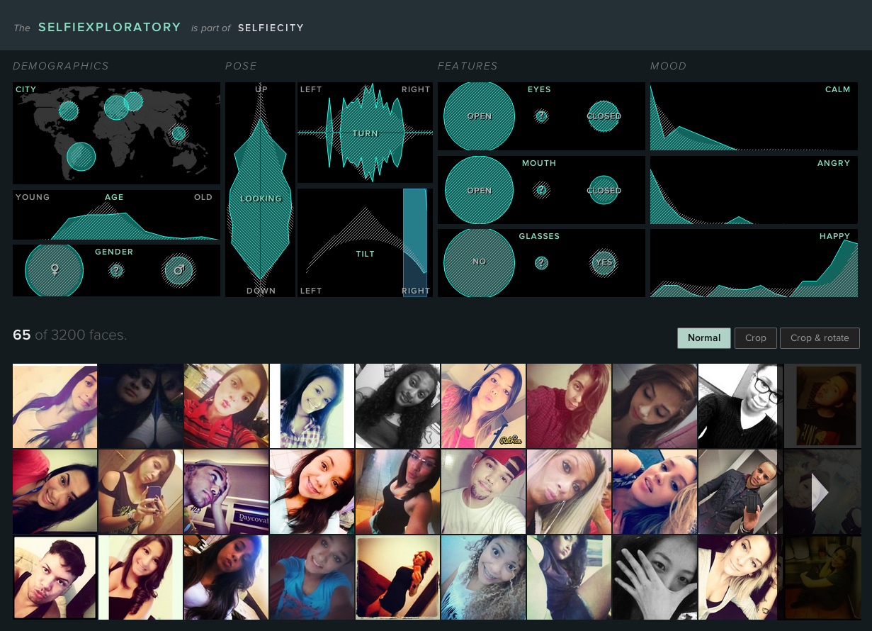 On the resulting set of selfie images, we ran automatic face analysis, supplying us with algorithmic estimations of eye, nose and mouth positions, the degrees of different emotional expressions, etc.